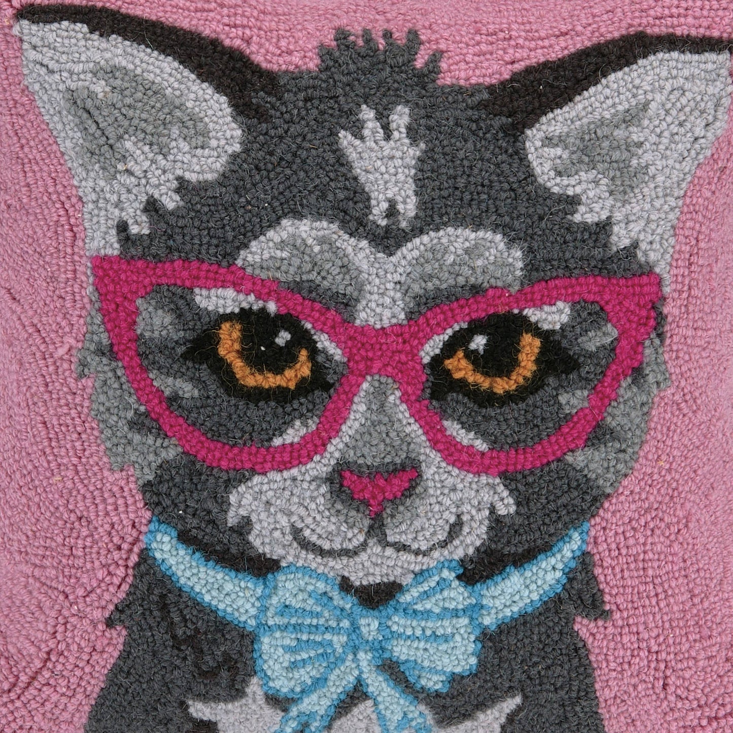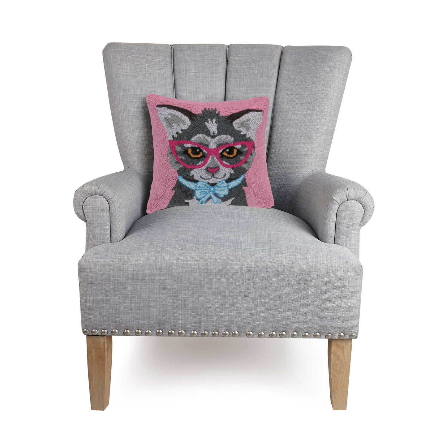 Add a touch of whimsy to your decor with this charming 16" square pillow featuring a stylish cat wearing pink glasses and a bow tie. The 100% wool face adds texture and detail, while the soft polyester velvet back ensures comfort. With a zipper closure and removable polyester insert, it’s easy to care for and perfect for cat lovers looking to liven up any space! ★100% wool hooked pillow ★100% velvet backing ★Includes polyester insert, zipper closure ★16X16" throw pillow