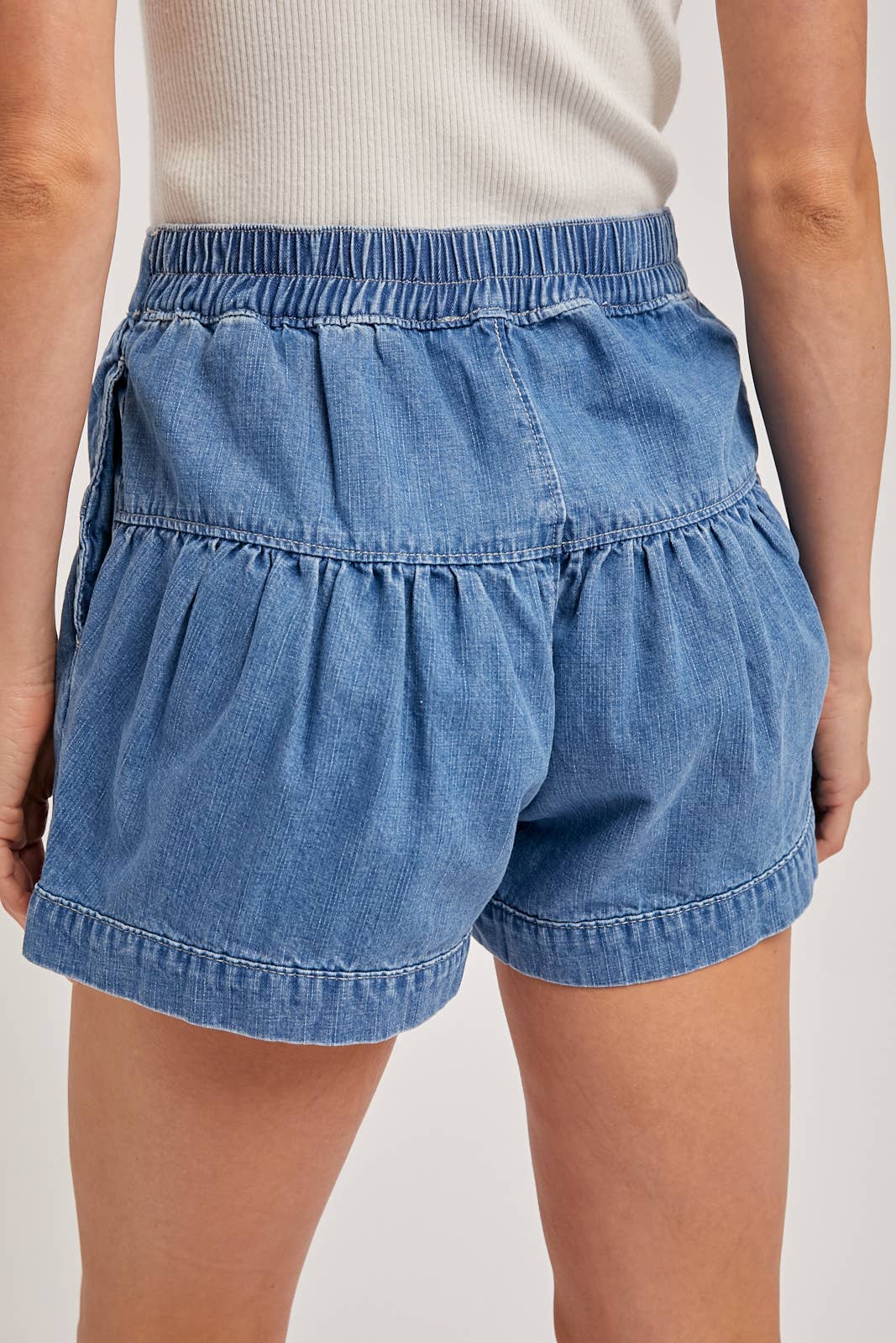 Featuring a distinctive tiered or ruffled style. A fitted yoke sits high on the waist and hips, defined by a prominent four-button fly with round, light brown, wood-like buttons. From the yoke, a gathered panel of denim flares out, creating a wide, floaty leg opening that gives the shorts a skirt-like silhouette. The shorts are made from a soft, light-blue denim and feature vertical seam detailing on the front panels. The model has her hands casually tucked into the side pockets, which are set into the gathered portion of the shorts. The hem is finished with a wide, stitched cuff.