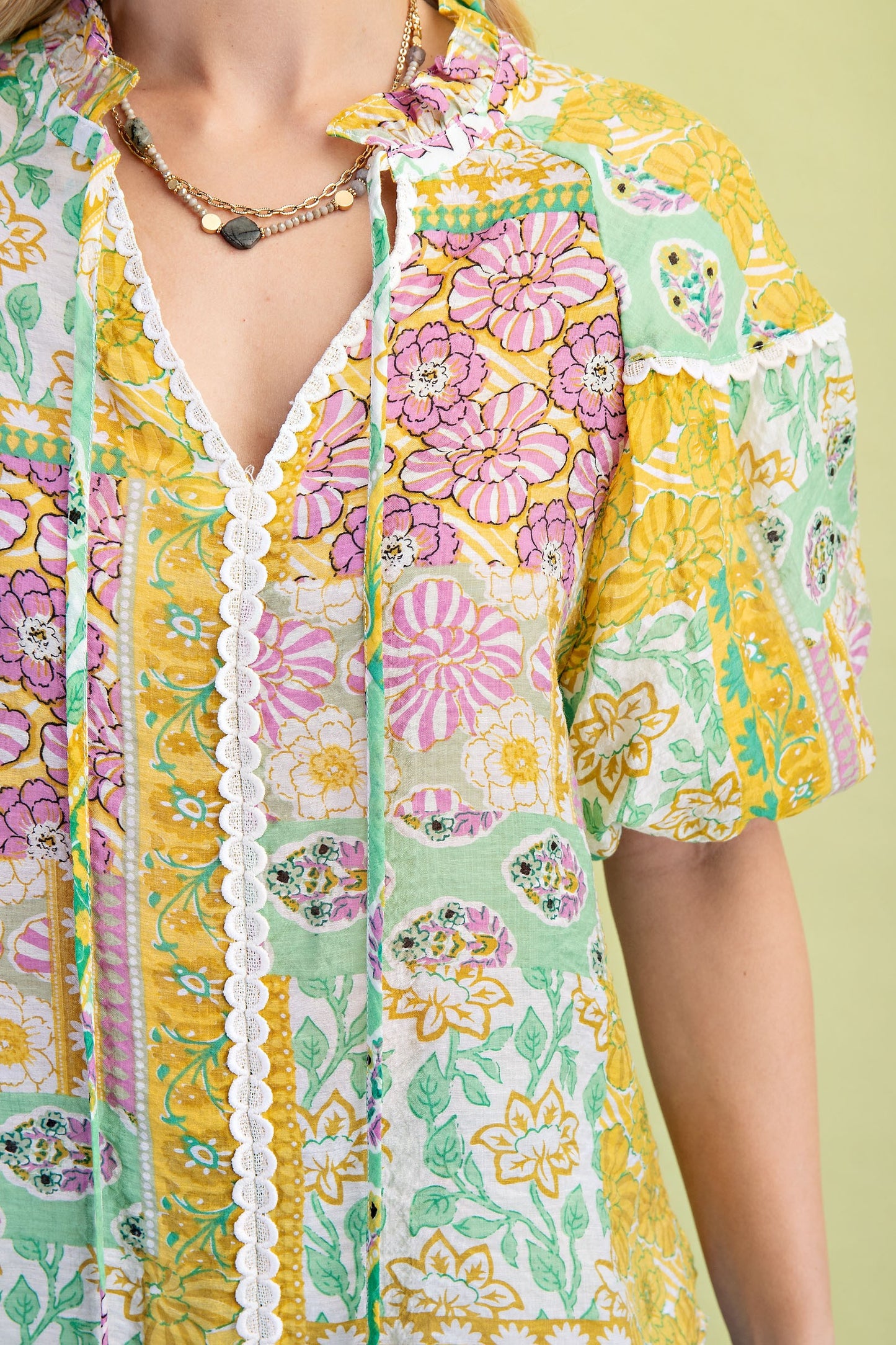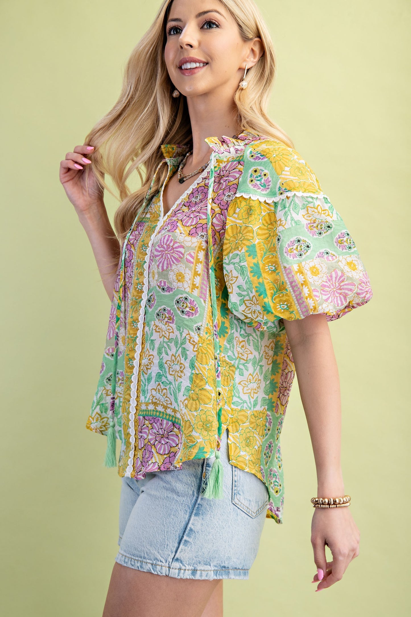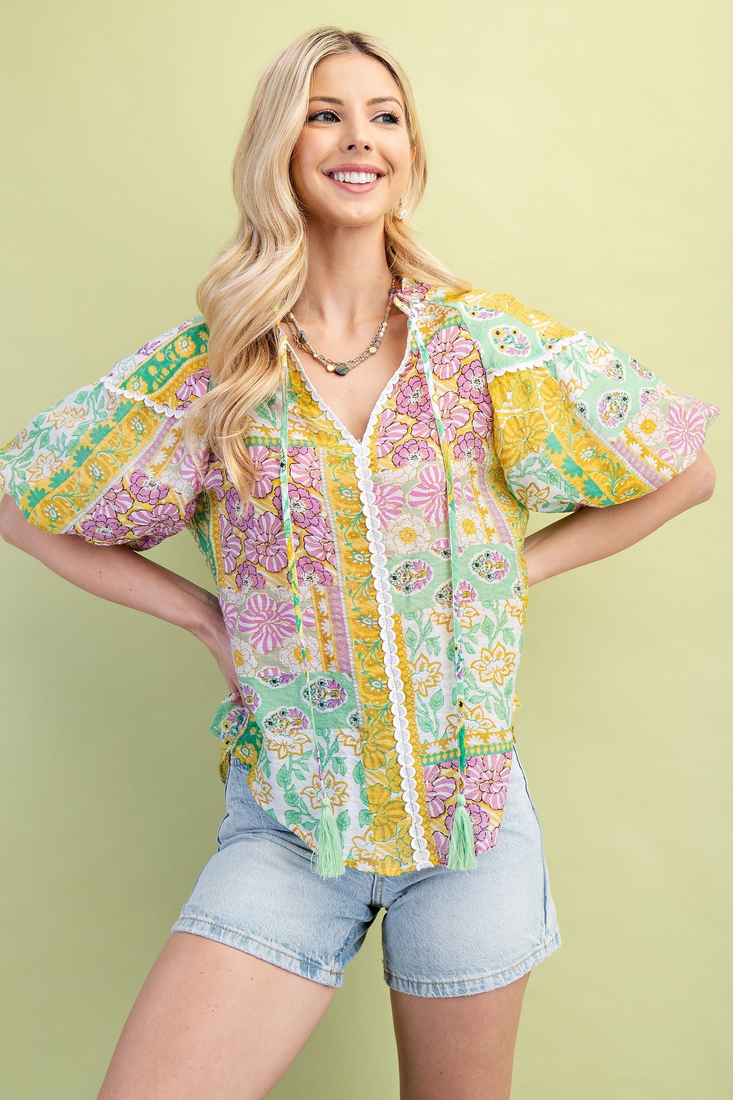 Mixed print puff sleeve top with a tassel neck tie and decorative trim details
