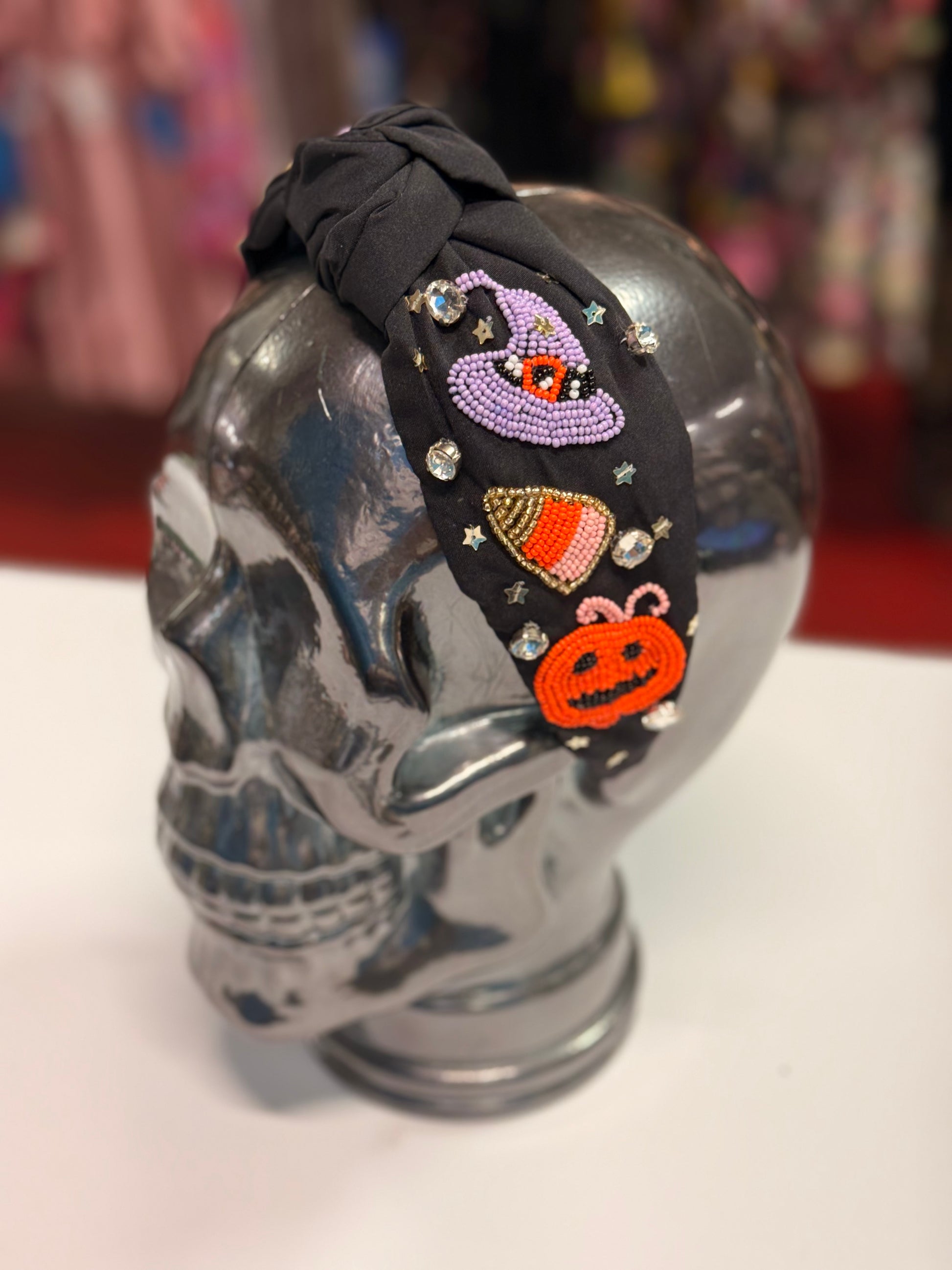 Our ghastly-good Halloween Rhinestone Top Knot Seed Beaded Handmade Headband will bewitch your Halloween style. Meticulously crafted by our accomplished artisans, this 1.25" wide headband is a one-size-fits-all charmer. Beading pattern includes a witch's hat, candy corn, and Jack O'Lantern. Put the finishing touches on your look with beaded earrings and your favorite purse!