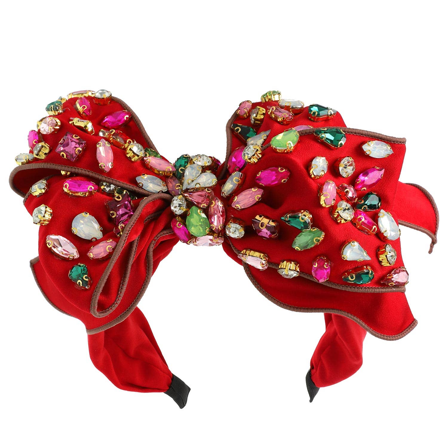 This headband features a large velvet bow embellished with high-quality gemstones for a luxurious holiday look. Its stretch band ensures a comfortable fit for any size. A perfect statement piece for a special occasion.