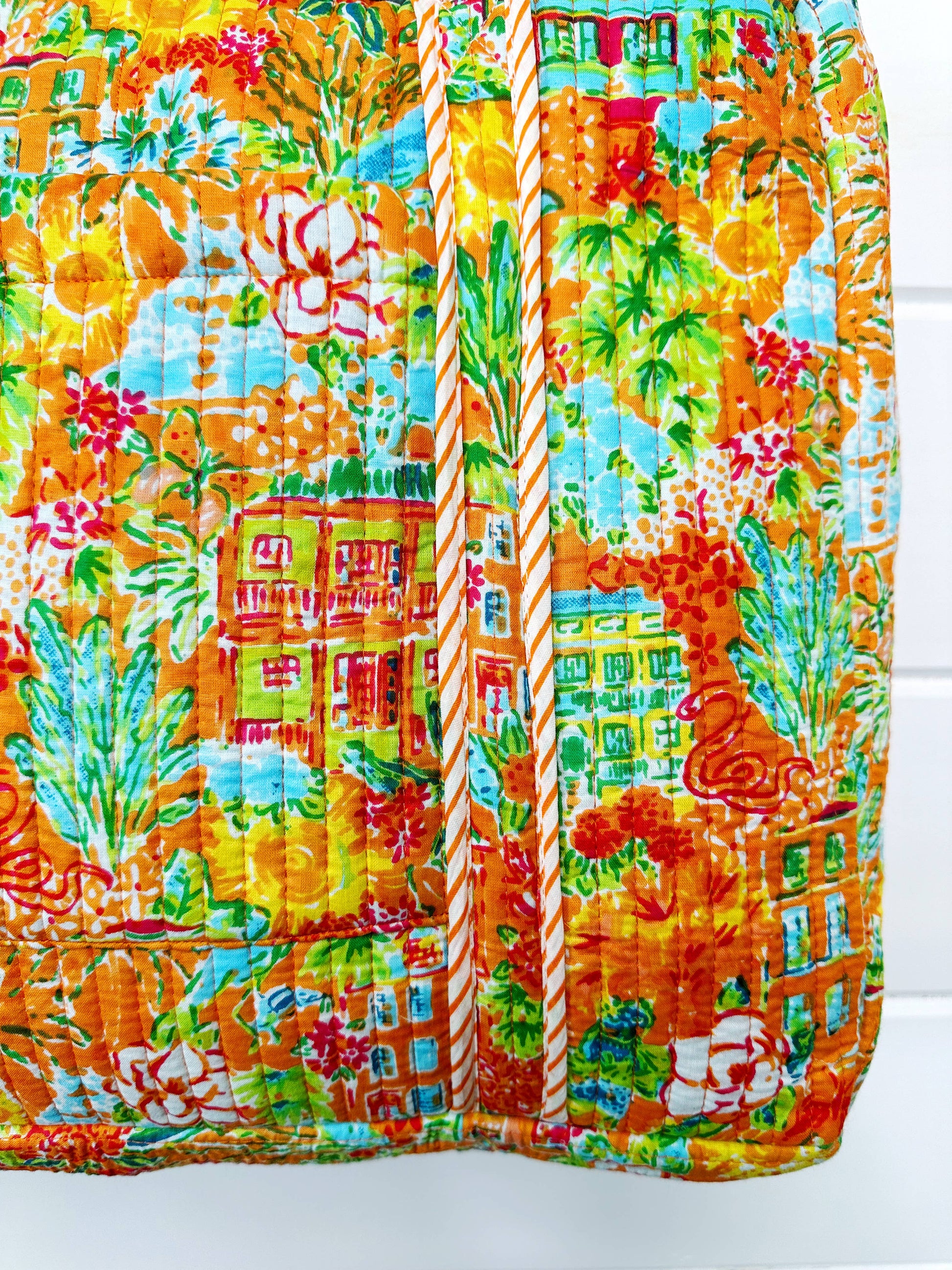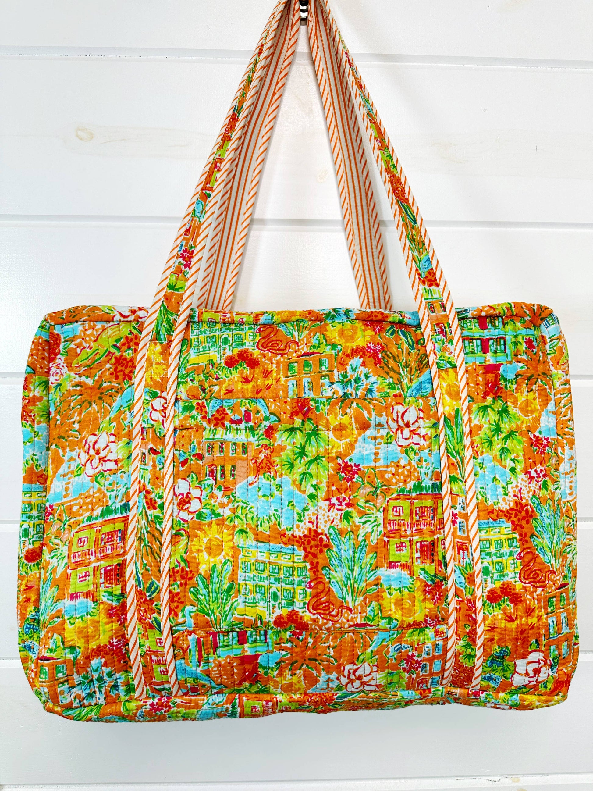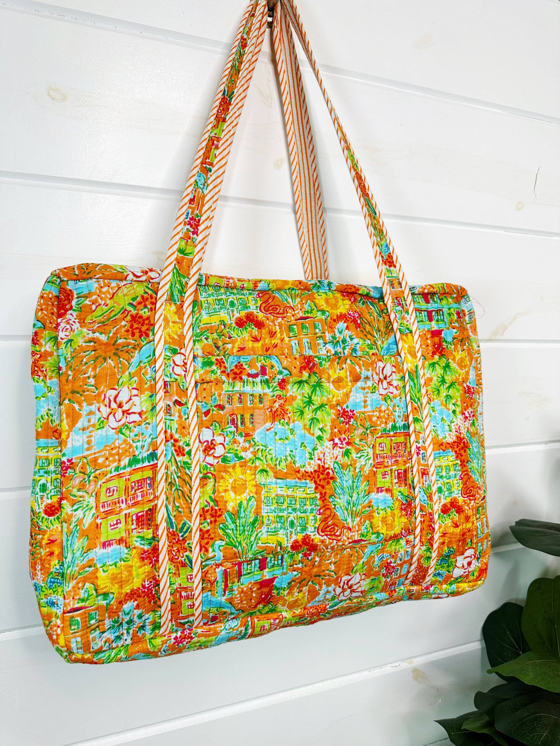 Travel in style with our orange Charming Tropical Southern Town Quilted Duffle Bag: Dolphins, Bees, Butterflies, Gators, Snakes, Palm Trees, Adorable Houses, & more! This print has it all!