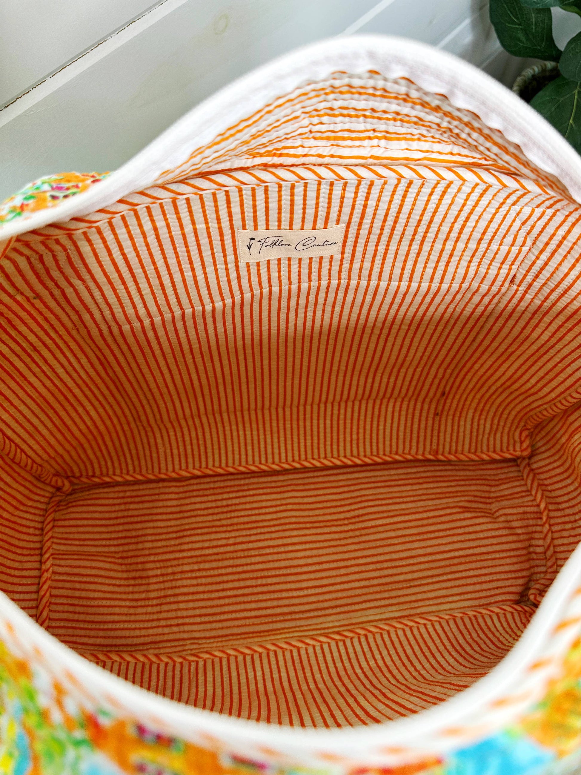 This spacious bag is ideal for overnight stays, weekend getaways, and light travel. Crafted from 100% cotton, featuring a hand block print with contrasting trim and interior. The exterior zipper pocket and secure zipper top closure ensure your essentials are easily accessible and safe.