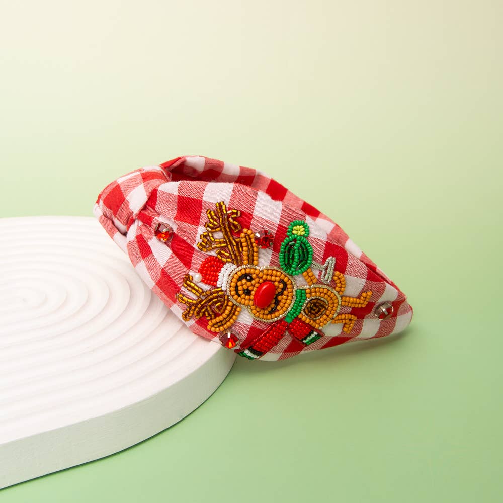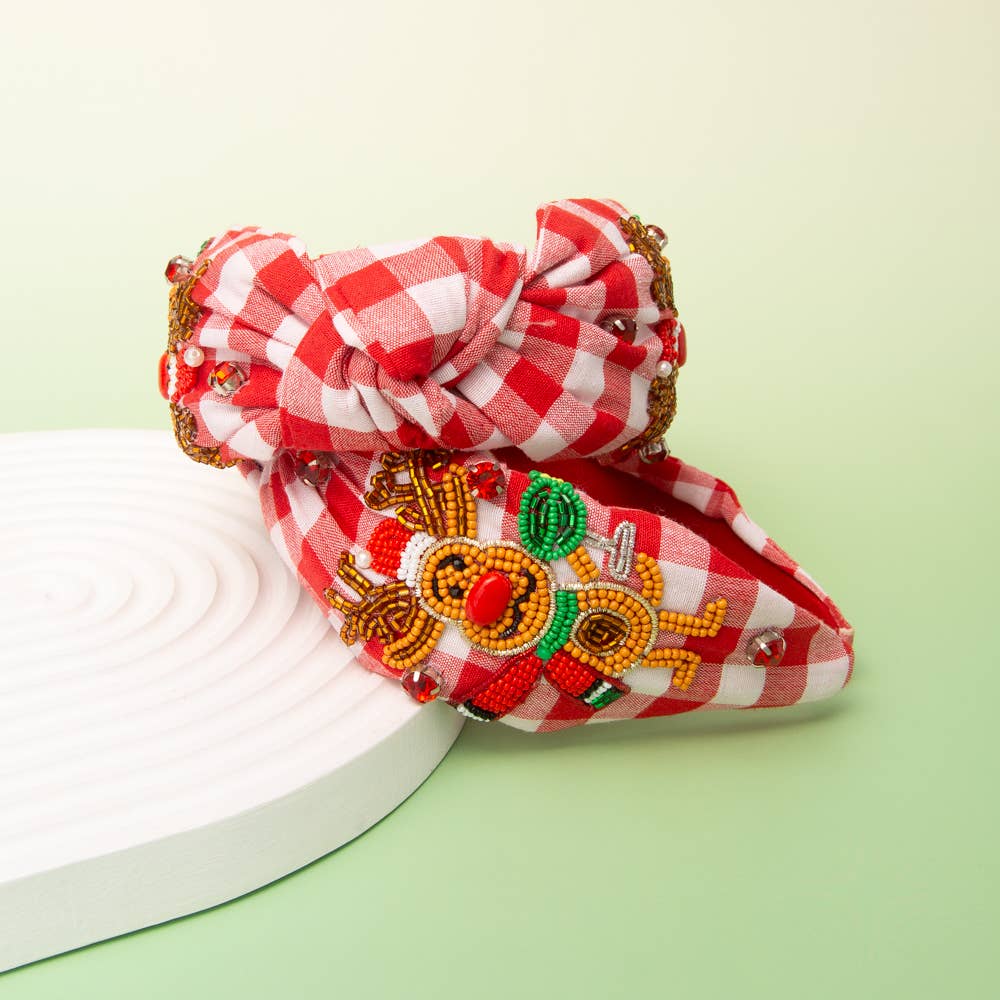 Celebrate the magic of the holidays with this charming reindeer-themed headband, adorned with seed beads, crystal and pearl accents, and a gingham-style detail for a playful seasonal twist. The top-knotted design features a secure cushioned band for a comfortable, flexible fit that’s both stylish and easy to wear all day.