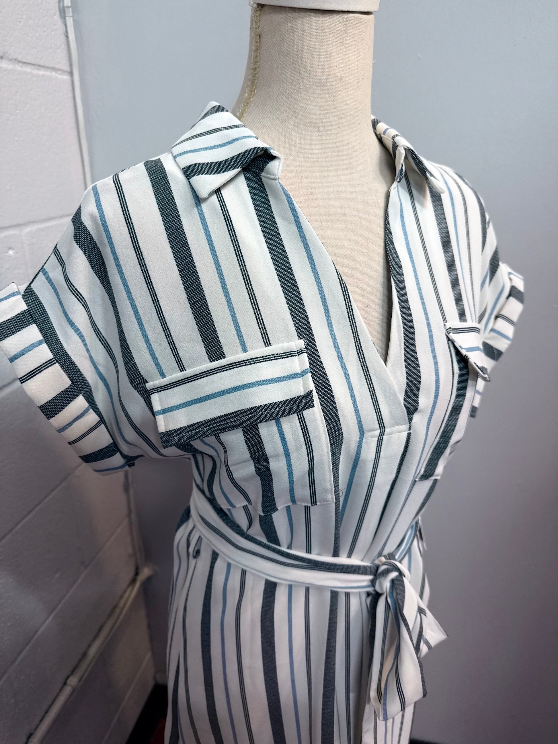 COLLARED V NECKLINE CHEST POCKET BELTED FOLDED SLEEVE STRIPE PATTERN NOT LINED MINI DRESS 100%POLYESTER