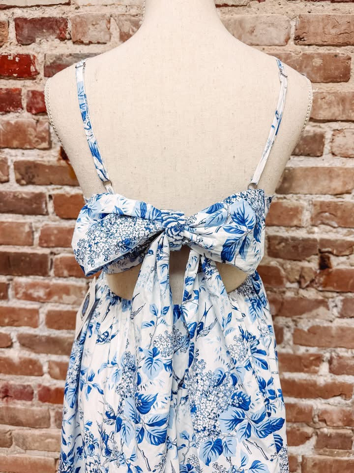Blue floral woven v neck fully lined dressed with back bow ribbon tie
